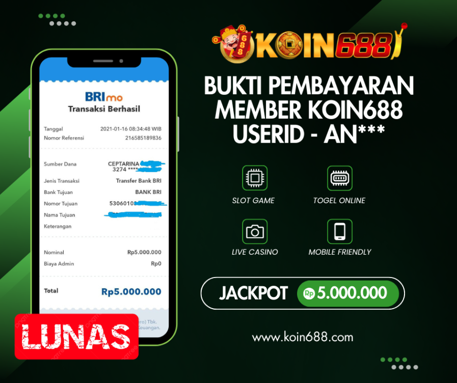 KOIN688 BUKTI PEMBAYARAN MEMBER USERID – AN*** Rp.5.000.000.,- LUNAS