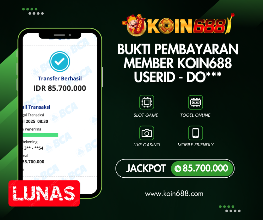 Selamat kepada User id : DO*** Telah berhasil mendapatkan kemenangan besar pada permainan SWEET BONANZA 1000kemenangan Sebesar Rp.85.700.000,Setelah mengisi formulir withdraw dengan kurung waktu hanya 5 – 10 menit pihak koin688 sudah melakukan transfer kepada pemilik Userid dan dana sudah dapat di cairkan oleh pemenang. Bukti pembayaran yang kami berikan merupakan bukti pembayaran yang SAH / VALID yang langung di dapatkan melaui tanda transfer transaksi dari Bank yang di tuju.