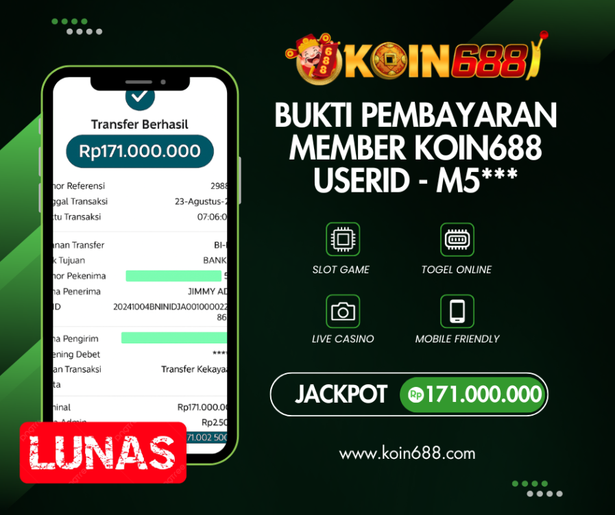 Selamat kepada User id : M5*** Telah berhasil mendapatkan kemenangan besar pada permainan TOGEL PASARAN TOTO MACAUkemenangan Sebesar Rp.171.000.000,Setelah mengisi formulir withdraw dengan kurung waktu hanya 5 – 10 menit pihak koin688 sudah melakukan transfer kepada pemilik Userid dan dana sudah dapat di cairkan oleh pemenang. Bukti pembayaran yang kami berikan merupakan bukti pembayaran yang SAH / VALID yang langung di dapatkan melaui tanda transfer transaksi dari Bank yang di tuju.