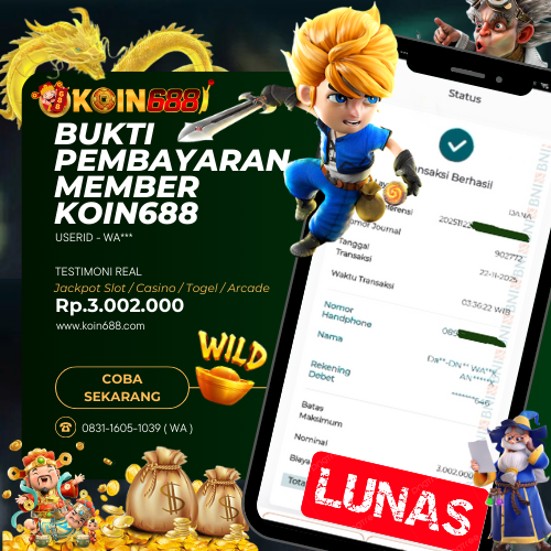 Selamat kepada User id : WA*** Telah berhasil mendapatkan kemenangan besar pada permainan SLOT GATES OF OLYMPUS 1000kemenangan Sebesar Rp.3.002.000,Setelah mengisi formulir withdraw dengan kurung waktu hanya 5 – 10 menit pihak koin688 sudah melakukan transfer kepada pemilik Userid dan dana sudah dapat di cairkan oleh pemenang. Bukti pembayaran yang kami berikan merupakan bukti pembayaran yang SAH / VALID yang langung di dapatkan melaui tanda transfer transaksi dari Bank yang di tuju.